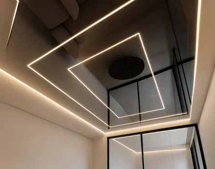 - Встраиваемая оригинальная подсветка разных типов (включая карниз) – от дизайнерского контурного света по периметру до парящих потолков для атмосферы.