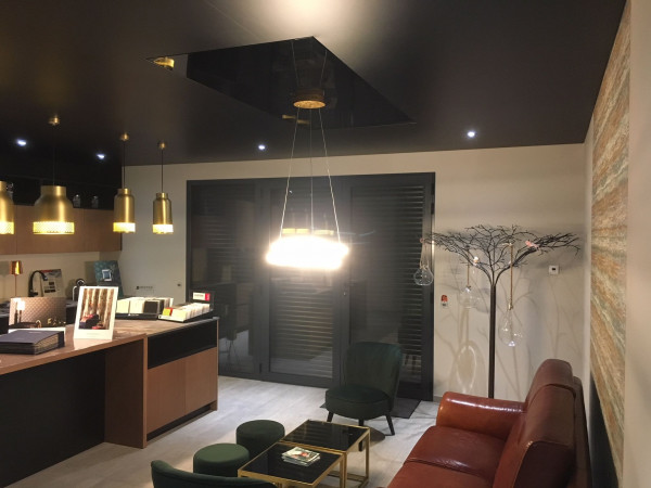 - Яркие тона хороши в нежилых пространствах вроде ресепшенов, клиник красоты, кафе, спортивных клубов. Сочные оттенки как в матовой, так и в глянцевой фактурах привлекают внимание.