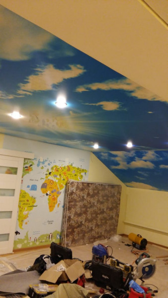 Во всех случаях вы получите яркий акцент в интерьере. Особенно часто «небо с облаками» заказывают в детские, спальни, гостиные.