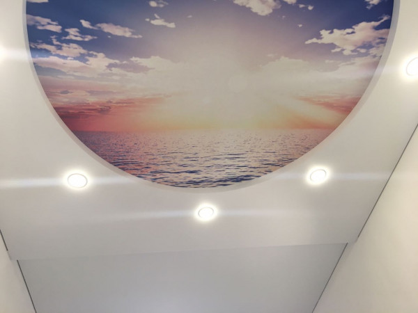 - со встроенной в запотолочное пространство подсветкой и полотном с фотопечатью в один уровень;