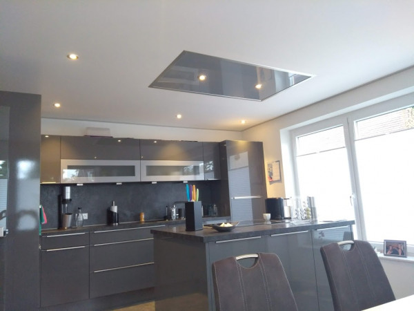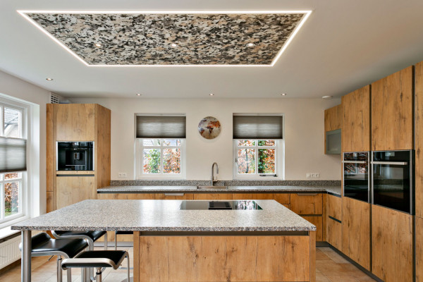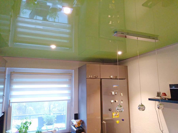 Далеко не все варианты потолочных покрытий могут использоваться в кухне. Одним из оптимальных станет натяжной потолок – он является влагостойким и достаточно прочным, не требует длительной уборки. На такой поверхности не будет скапливаться жир или другие загрязнения, благодаря чему потолок всегда будет оставаться чистым и привлекательным. По необходимости его можно протереть сухой или влажной салфеткой – никаких других действий не потребуется.