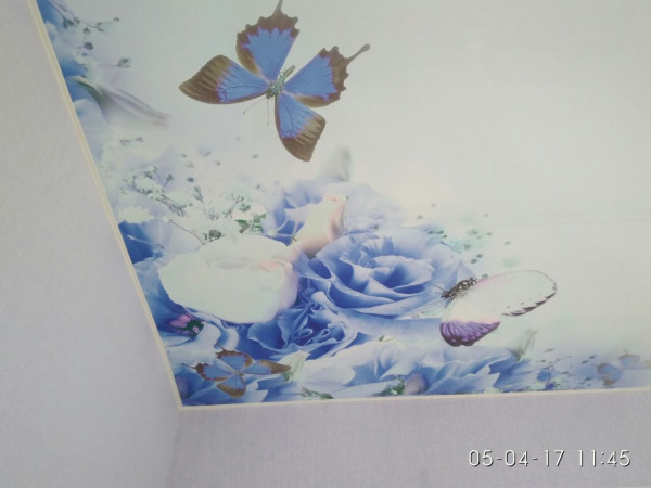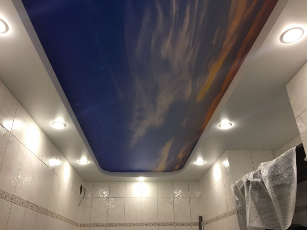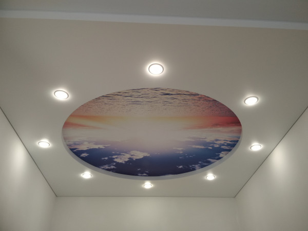 Конечно, базовым потолком является белый в матовой фактуре. Однако, отделка полотном с изображением не сдает позиций.