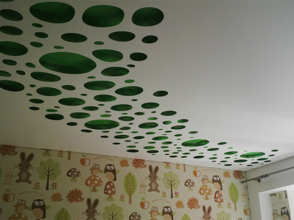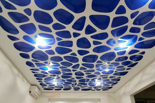 Чаще всего резные натяжные потолки монтируются с использованием двух контрастных цветов разных материалов. Например, сочетание красного матового с глянцевым белым и наоборот. Такой прием создает дополнительную глубину рисунка даже без использования подсветки.