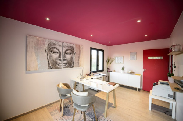 - Яркие тона хороши в нежилых пространствах вроде ресепшенов, клиник красоты, кафе, спортивных клубов. Сочные оттенки как в матовой, так и в глянцевой фактурах привлекают внимание.
