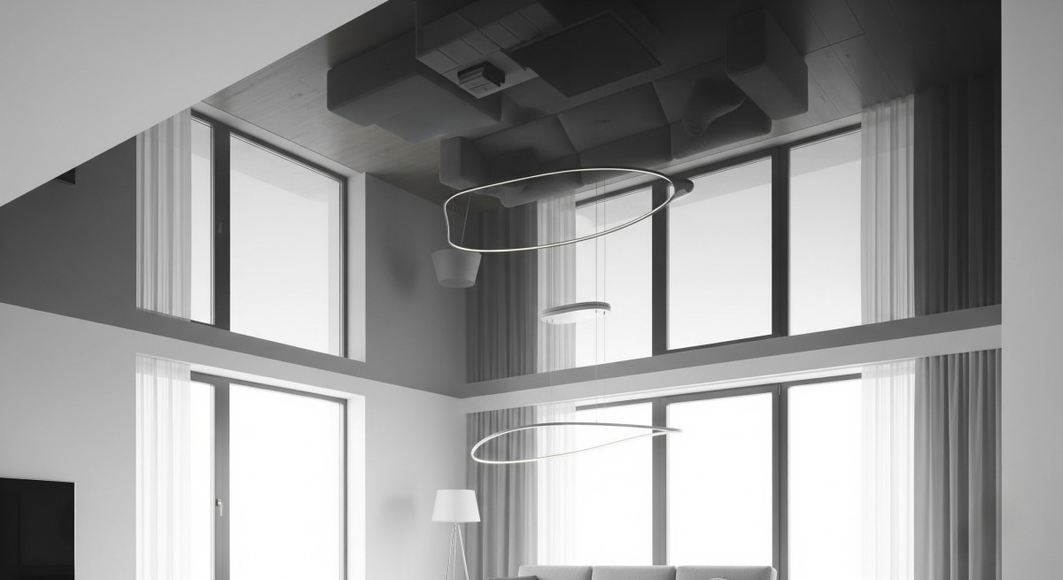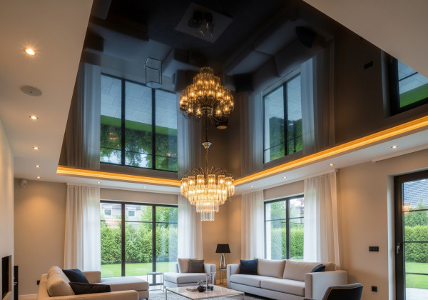 Ничто так не делает комнату визуально больше, как лаковые полотна. В зависимости от оттенка они в разной степени отражают предметы, источники света. Иногда они выглядят как темное зеркало.