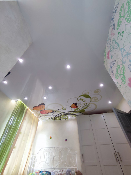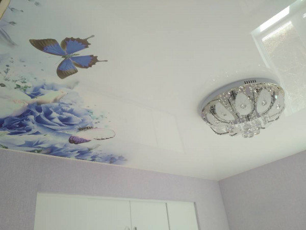 Конечно, базовым потолком является белый в матовой фактуре. Однако, отделка полотном с изображением не сдает позиций.