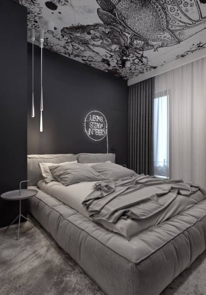 - Актуальны покрытия с рисунком, переходящим с потолка на стену. Желательно, чтобы это было одно изображение, но допустимо и использование просто одной цветовой гаммы. Такой дизайн легче всего интегрировать в мансардных помещениях.