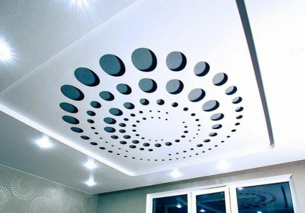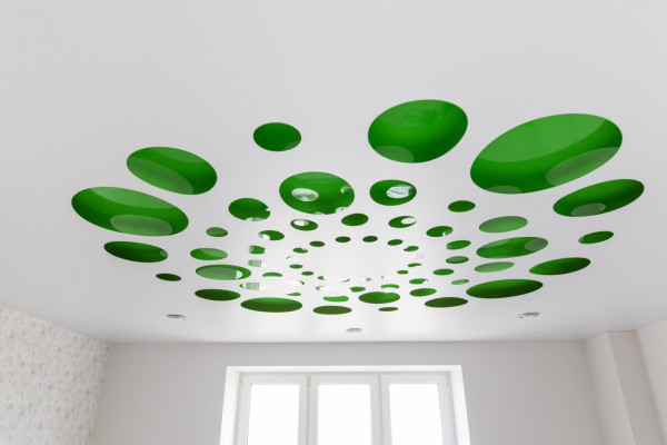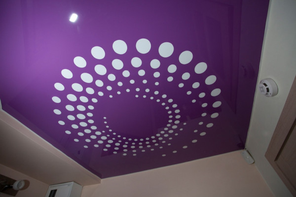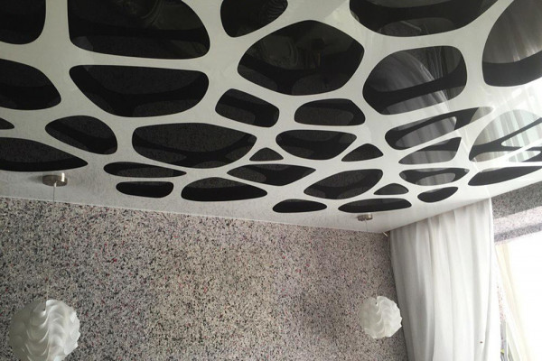 Чаще всего резные натяжные потолки монтируются с использованием двух контрастных цветов разных материалов. Например, сочетание красного матового с глянцевым белым и наоборот. Такой прием создает дополнительную глубину рисунка даже без использования подсветки.